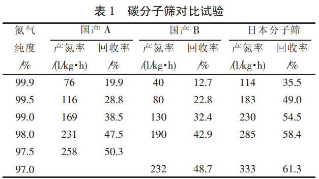 采用國內(nèi)兩個(gè)廠家及日本生產(chǎn)的碳分子篩進(jìn)行對比試驗(yàn),試驗(yàn)結(jié)果見表1。