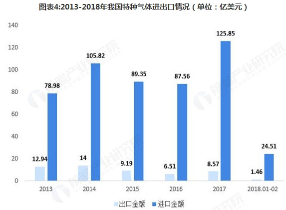 從特種氣體進(jìn)出口金額來看,我國特種氣體主要以進(jìn)口為主,進(jìn)口金額遠(yuǎn)遠(yuǎn)超過出口金額,截止2018年2月,我國特種氣體進(jìn)出口金額分別為24.51億美元、1.46億美元。