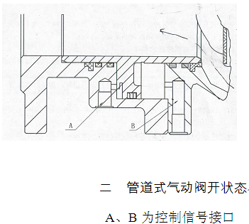 通過切換閥體上的A、B控制氣源接口處的壓縮氣體,活塞即可作直線往復(fù)運動,當(dāng)A口進氣時,活塞便向副閥體靠緊,切斷流體,呈現(xiàn)出關(guān)閉狀態(tài),如圖一所示:當(dāng)B口進氣時,活塞向主閥體靠緊,接通流體呈現(xiàn)出開啟狀態(tài),如圖二所示。