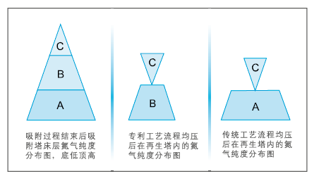 該流程對傳統(tǒng)工藝流程下均壓位置作了改進。提高了氮氣回收率和碳分子篩利用率,降低了能耗,改變了利用變壓吸附不能制取高純氮氣(99.9995%N2)的歷史。