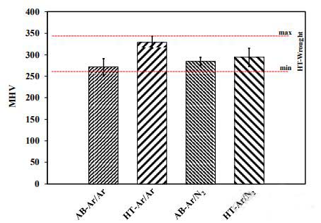 3、在氮氣保護(hù)氣體下制造的試樣的硬度略高于在氬氣下制造的試樣的硬度。這歸因于由于在氮氣氛下提供的較高冷卻速率而獲得的更精細(xì)的微結(jié)構(gòu)。