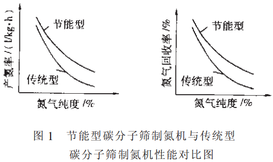 (2)節(jié)能型碳分子篩制氮機(jī)采用不等勢均壓流程,顯著提高了碳分子篩的產(chǎn)氮能力和回收率,減少了制氮能耗,可直接獲取 99.995%的高純氮?dú)?,填補(bǔ)了國內(nèi)不足。