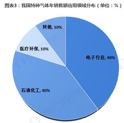 據(jù)相關(guān)數(shù)據(jù)統(tǒng)計(jì),目前,在我國特種氣體年銷售額中,電子行業(yè)約占40%,石油化工約占40%;醫(yī)療環(huán)保約占10%,其它約占10%。