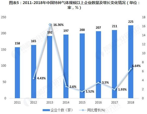 中國的特種氣體企業(yè)市場規(guī)模普遍不大,大多數(shù)企業(yè)為中小型企業(yè)。從企業(yè)性質(zhì)來看,在中國氣體行業(yè)中占據(jù)重要地位的是三資企業(yè)和民營企業(yè)。截至2017年底,我國特種氣體行業(yè)規(guī)模以上企業(yè)數(shù)量達(dá)到211家,較上年增加4家。保守估計(jì)2018年我國特種氣體企家數(shù)量為225家。