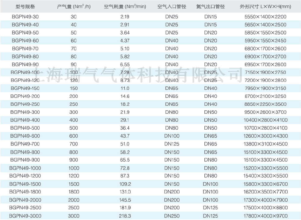 瑞氣BGPN系列分子篩制氮設(shè)備根據(jù)氮?dú)饧兌确譃槭N型號,即:BGPN97、BGPN98、BGPN99、BGPN295、BGPN39、BGPN395、BGPN49、BGPN495、BGPN59、BGPN595。