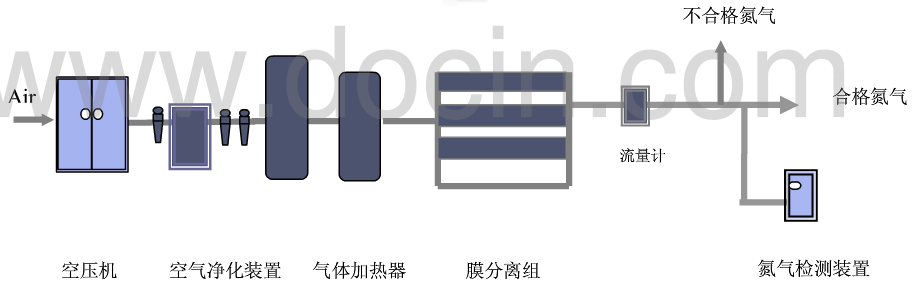 瑞氣膜分離制氮機(jī)由以下幾部分組成:壓強(qiáng)空氣氣源(空壓機(jī))、壓縮空氣凈化組件、氣體加熱裝置、中空纖維膜組、氮?dú)鈾z測(cè)系統(tǒng),簡(jiǎn)要流程示意圖如下: